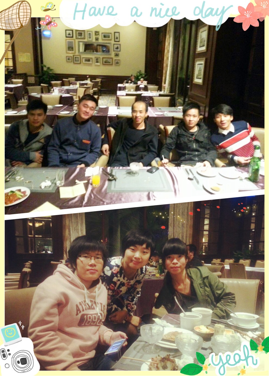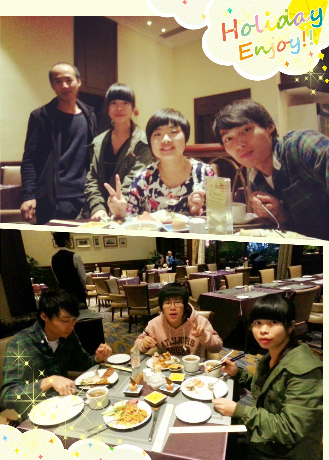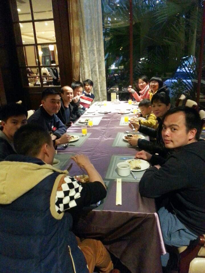 一張長桌只能坐10位,我們一行14人分坐2桌。